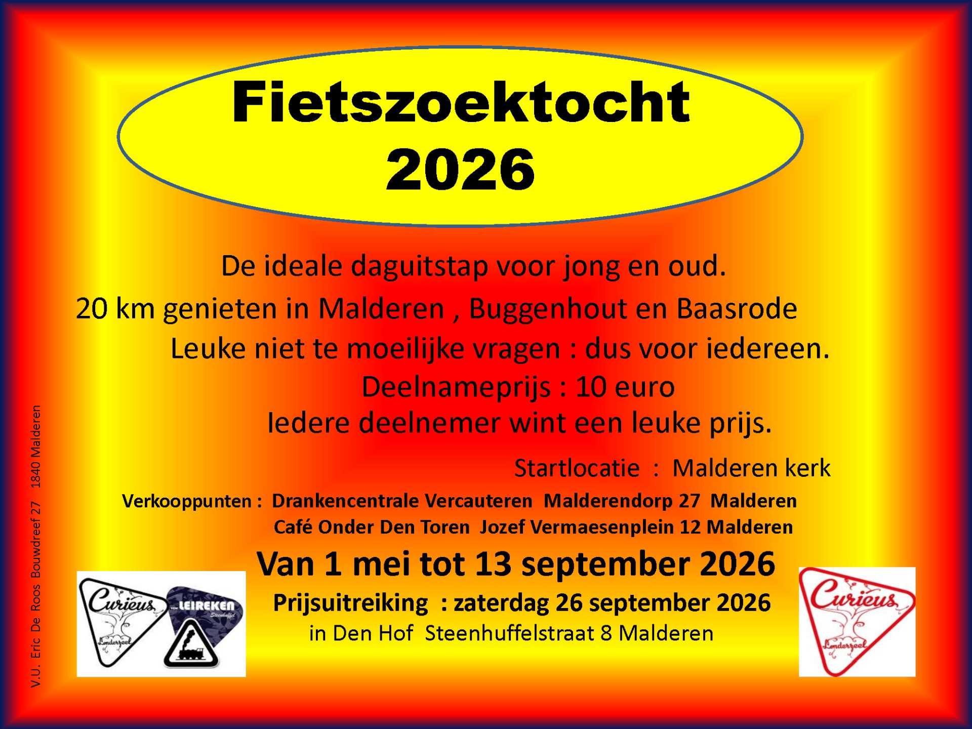 Op 1 mei klinkt het startschot voor de vierde editie van onze Fietszoektocht, met start aan de kerk van Malderen. Net als voorgaande jaren neemt het deelnameboekje je mee langs prachtige landschappen. Na de tocht door Malderen, Londerzeel, Imde en Steenhuffel heb je ongeveer van 20 km in de benen. Dit is dé gelegenheid om samen met vrienden of familie op pad te gaan, want hoe meer speurders, hoe groter de kans om de juiste antwoorden te vinden. Geen zorgen als je een antwoord niet meteen weet – fiets gerust verder en probeer het later nog eens. Je hebt namelijk tijd tot 13 september om je deelname af te sluiten! De spannende prijsuitreiking vindt plaats op 26 september.